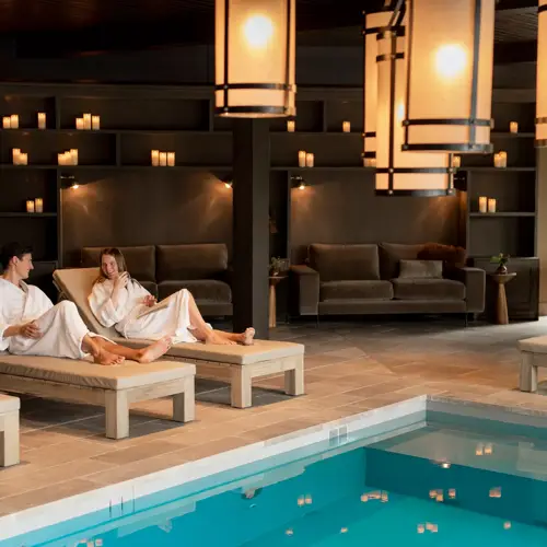 Vom Hotel aus gelangen Sie über einen gepflasterten Weg direkt in unseren privaten Wellness-Garten, eine grüne Oase mit Schwimmbad, Saunahäusern und Ruhebereichen. Über den Außenpool schwimmen Sie direkt zum Innenpool. Sowohl der Innen- als auch der Außenbereich sind mit Duschen und bequemen Liegestühlen ausgestattet. Dieser exklusive Service ist kostenlos und steht nur den Hotelgästen zur Verfügung.