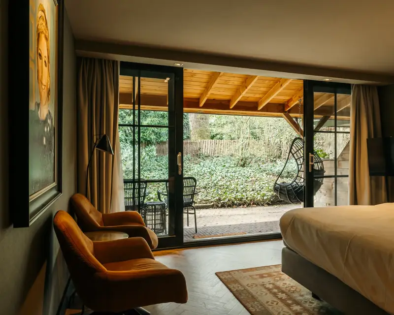 Dieses neue, gemütlich eingerichtete Hotelzimmer bietet Aussicht und direkten Zugang zum Wellnessgarten an der Seite des Hotels. Die Zimmer sind mit einem halb offenen Badezimmer mit ein Bad, einer Duschkabine ausgestattet enthält eine Sunshower (Sunshower ist ein Wellness-Gerät, das angenehme Infrarot-Wärme und Dosis von Sonnenlicht beim Dusche und köstlich die Muskeln erwärmt) und WC, exklusive 'Nilson Beds' Boxspringbetten mit ein Doppel Topper, Schreibtisch, Sitzecke, Telefon, Kühlschrank (leer) und drahtloses Internet. Sie können auch bei gutem Wetter die Terrassentüren öffnen nach Ihnen eigen Balkon. Das Zimmer ist mit Klimaanlage versehen. Hunde sind erlaubt.