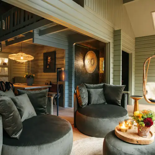 The Boshut of Van der Valk Hotel Apeldoorn - De Cantharel is hidden in nature and offers complete privacy. Enjoy a cozy interior, heated outdoor pool, and views of the Veluwe forests, including breakfast and access to hotel facilities.