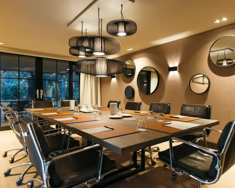 Room 104 is an intimate meeting room with a fixed block layout and access to a spacious private balcony. The room can accommodate up to 11 people.