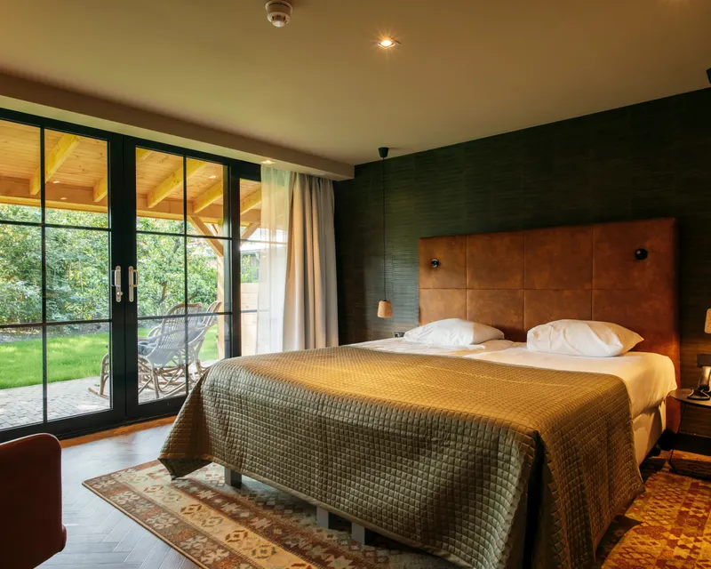 Deze warm ingerichte hotelkamer heeft prachtig uitzicht op de binnenzijde van het hotel. De kamers zijn voorzien van een half open badkamer met een afgesloten douche voorzien van een Sunshower (Sunshower is een wellness apparaat dat aangename infraroodwarmte en gedoseerd zonlicht geeft tijdens het douchen en heerlijk verwarmend is voor de spieren) en toilet, exclusieve bedden van 'Nilson Beds' met tweepersoons topper, flatscreen, bureau, zithoek, telefoon, koffie- en theefaciliteiten, koelkast (leeg), wireless hotelkameraudio en draadloos internet. Bovendien kunt u bij mooi weer heerlijk genieten van het terras met veranda. De kamers zijn voorzien van klimaatbeheersing. Honden zijn op deze kamers toegestaan.